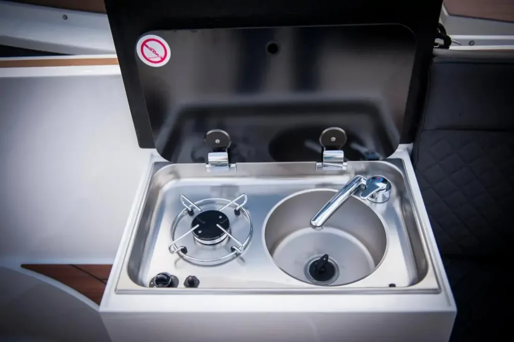 De Maxima 730 Tender is slim ontworpen met een compacte maar functionele toiletruimte. Deze bevindt zich voor in de sloep en is afsluitbaar voor extra privacy. Dankzij de efficiënte indeling blijft er voldoende bewegingsruimte over in de boot. De toiletruimte is ideaal voor langere tochten, zodat comfort en gemak altijd binnen handbereik zijn. Optioneel kan de ruimte worden voorzien van een chemisch toilet of een vast toilet met vuilwatertank.