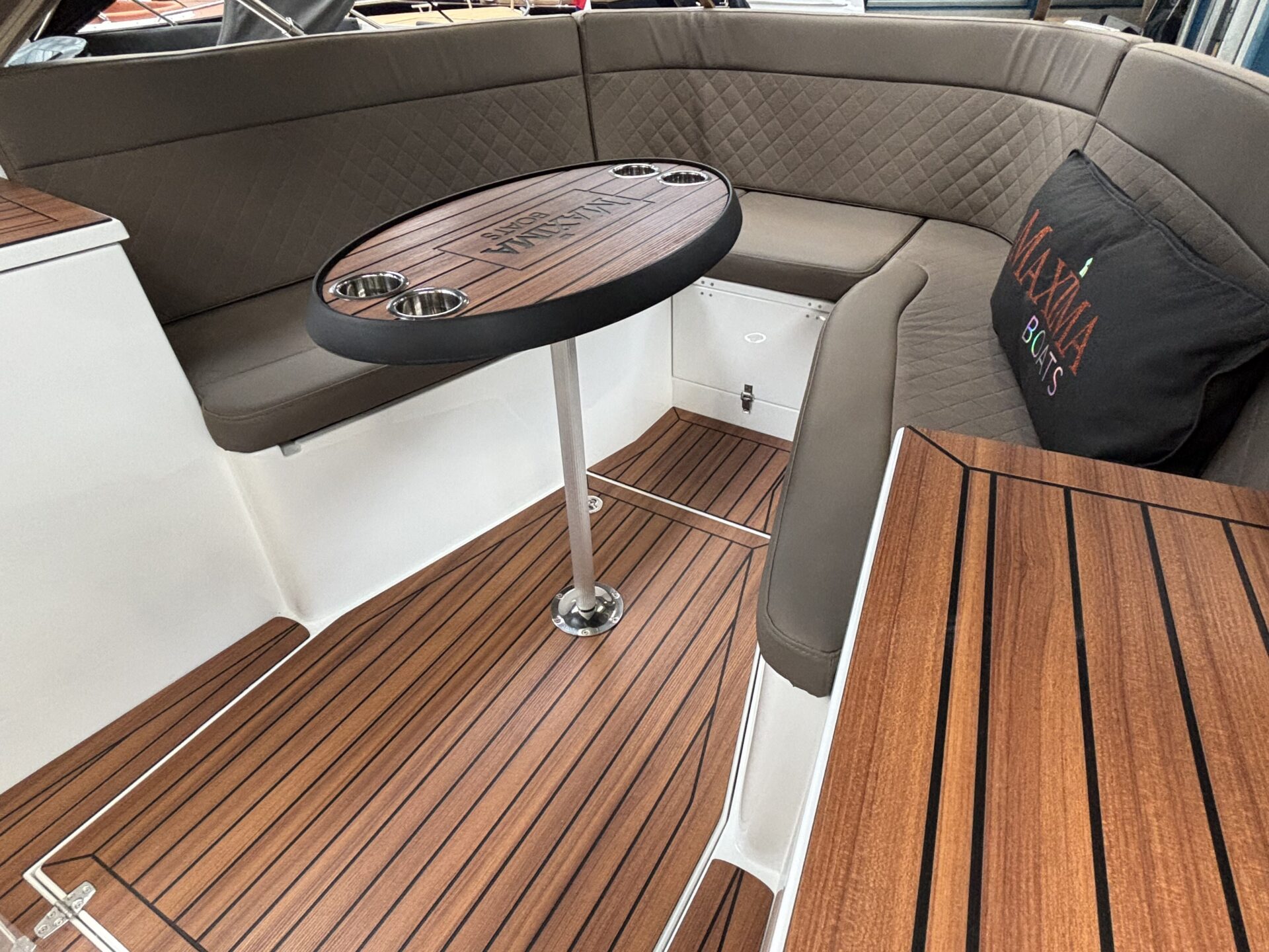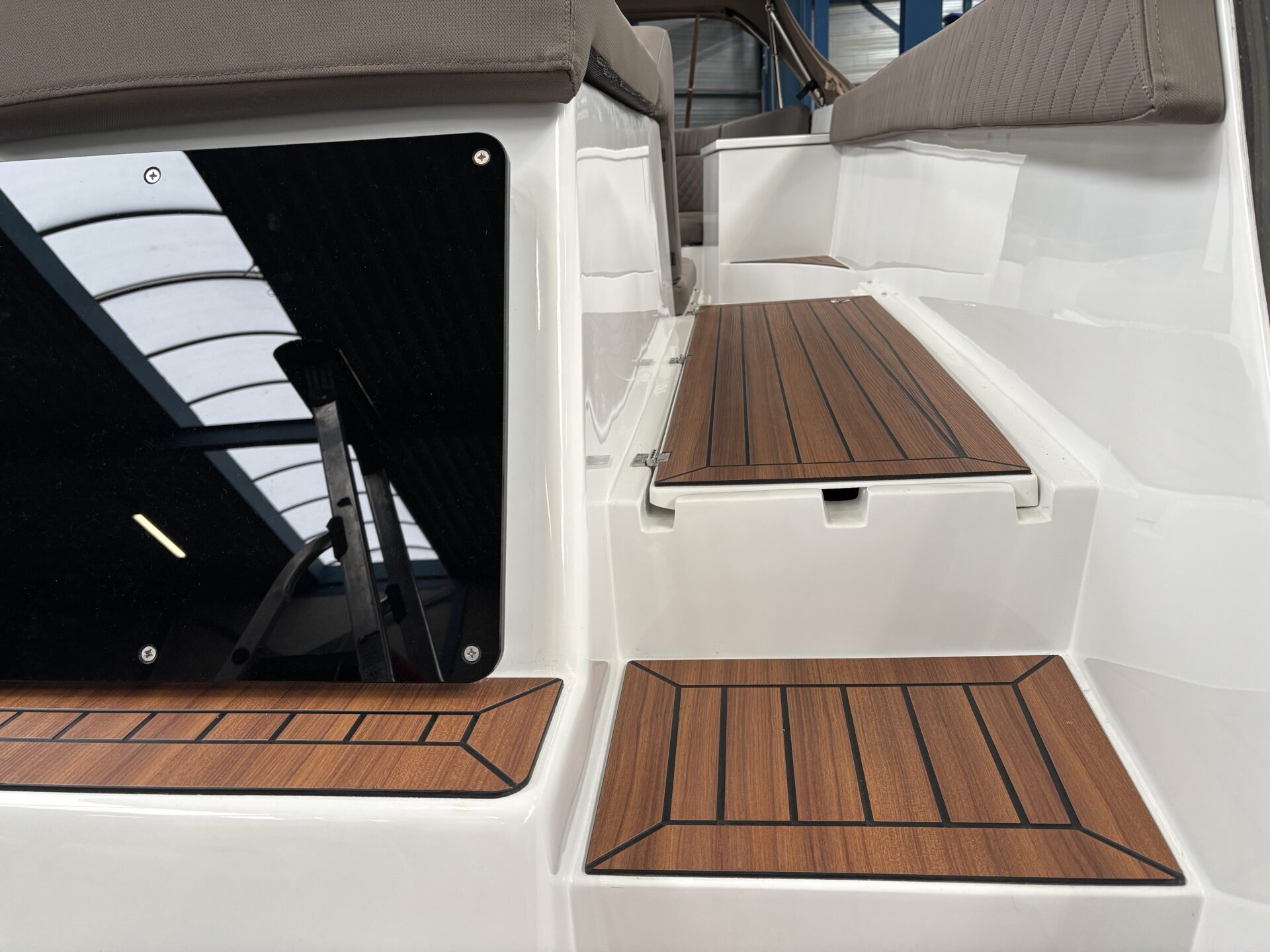 - Deluxe pakket met bruin finteak: finteak vloer – finteak op zwemplateau – finteak op opbergruimte of koelkist – finteak afwerkrand bovenop dek – navigatieverlichting LED in de boeg – rondomschijnend toplicht LED – automatische bilgepomp – schakelpaneel op console met 12V aansluiting