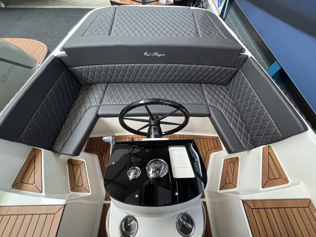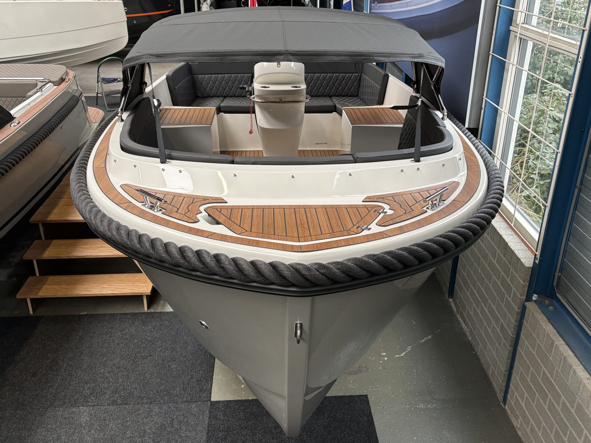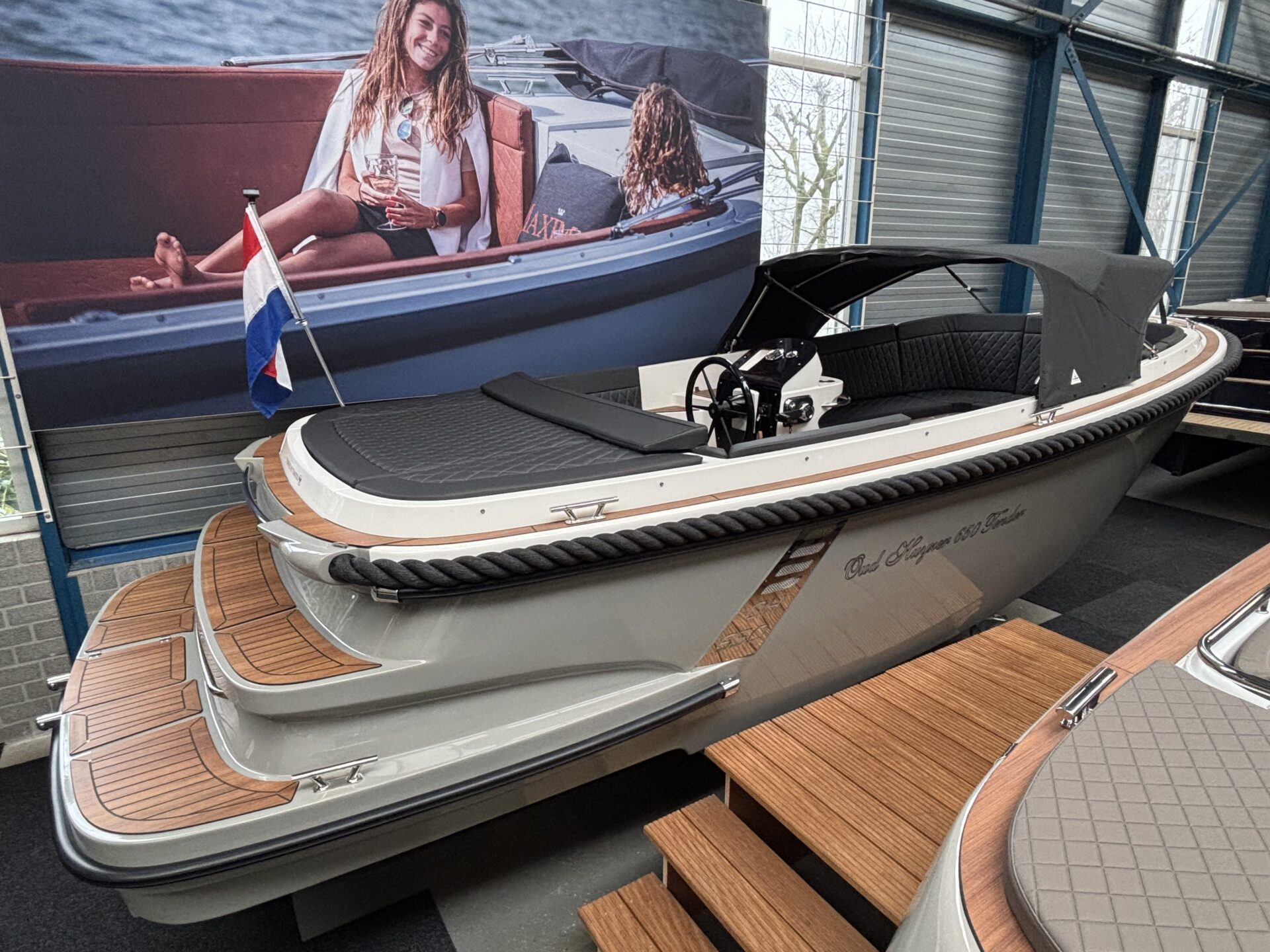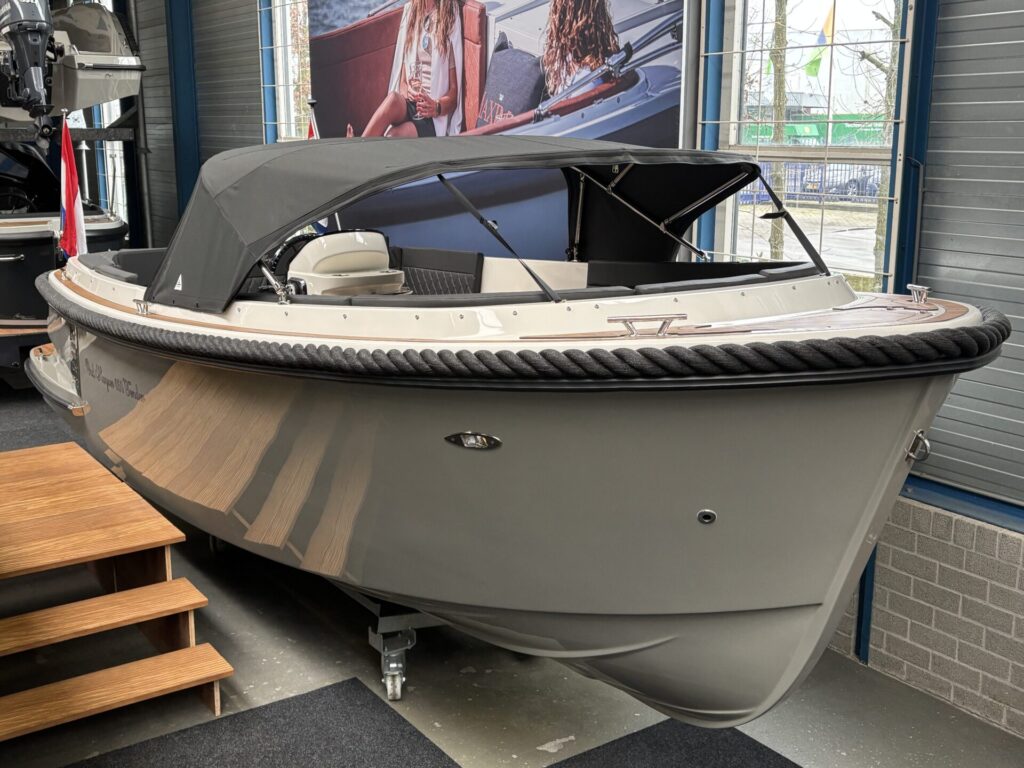 Deze nieuwe tender van Oudhuijzer kenmerkt zich door o.a. de hoge gangboorden, zodat u veilig met uw familie en kinderen aan boord kunt vertoeven. Het comfort is door de hoge rug kussens werkelijk zeer goed. Het zonnedek kunt u gemakkelijk opruimen onder de voorbanken, zodat deze niet in de weg ligt. Aan de achterzijde naast de motor heeft u riante opbergvakken voor bijvoorbeeld u fenders. Tevens beschikt de boot over 4 grote opbergvakken, waarvan 1 is geplaats in de vloer, bijvoorbeeld voor een inbouwtank.