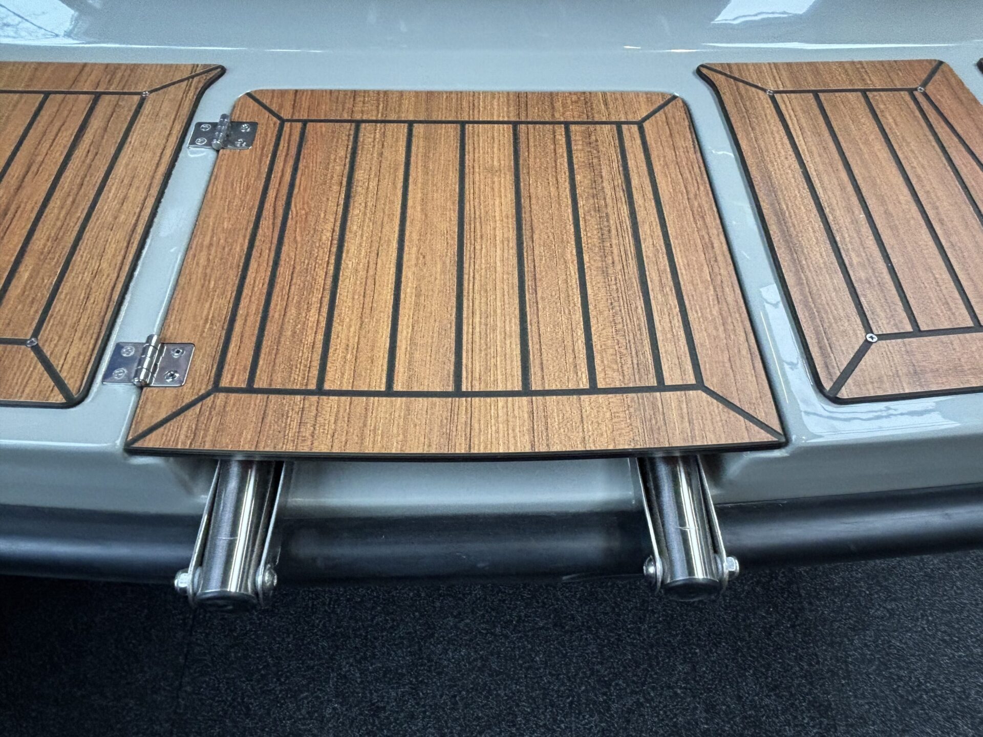- HPL teak vloer in kuip, op opstapjes voordek en zwemplateau