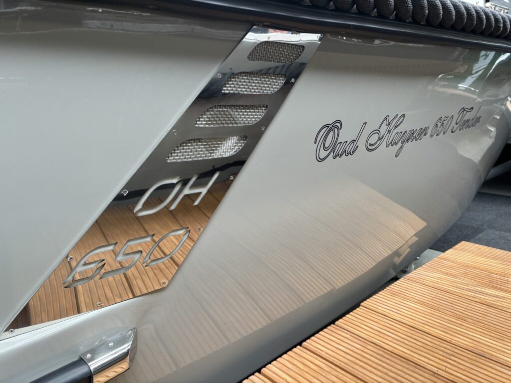 Deze stijlvolle Oud Huijzer 650 Tender, uitgevoerd in de chique kleurencombinatie Steenrgrijs met een witte binnenschaal en voorzien van een krachtige 60 pk motor.